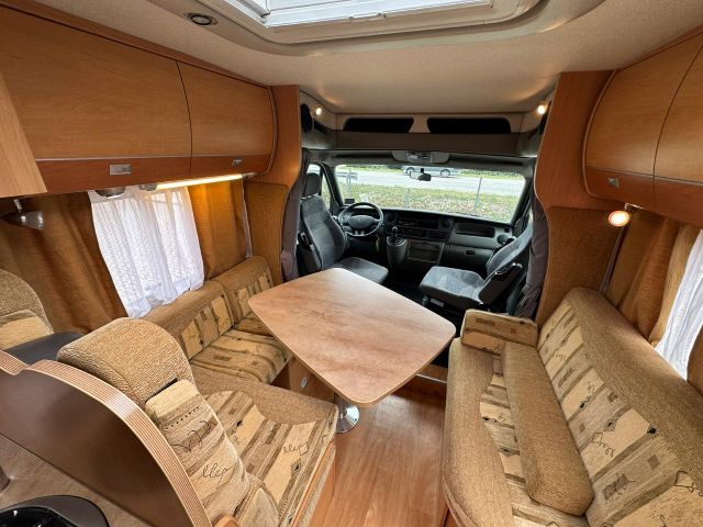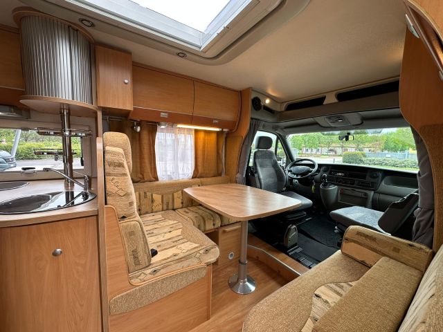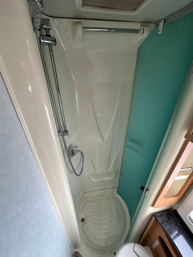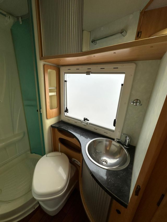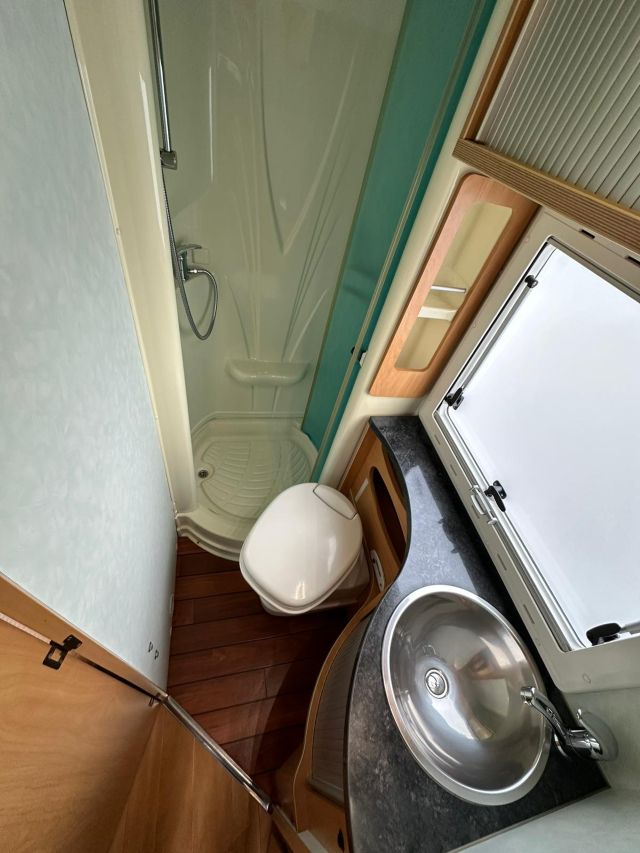 Semintegrale con semi-dinette avanzata e divanetto laterale, cucina laterale ad ‘L’, letto alla francese, bagno e doccia in coda.
