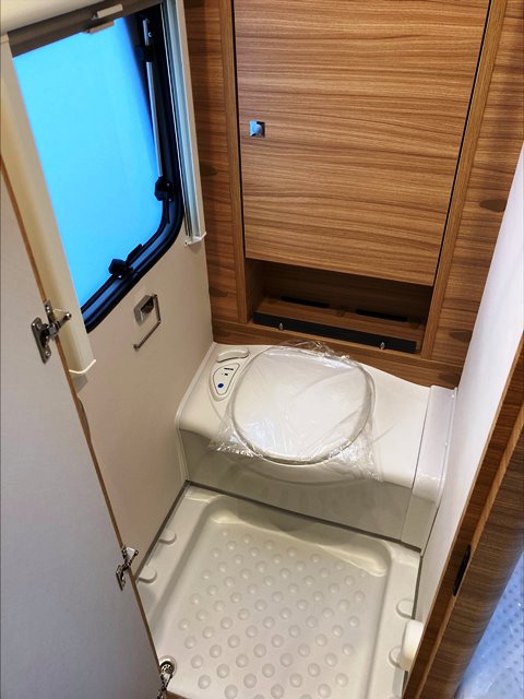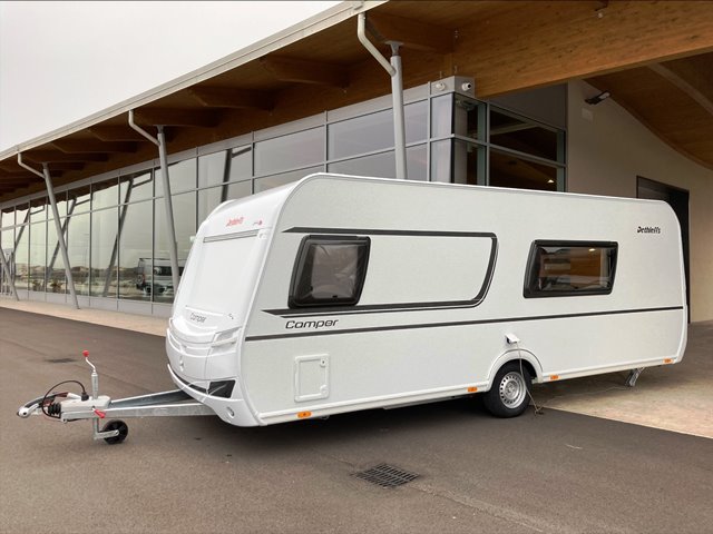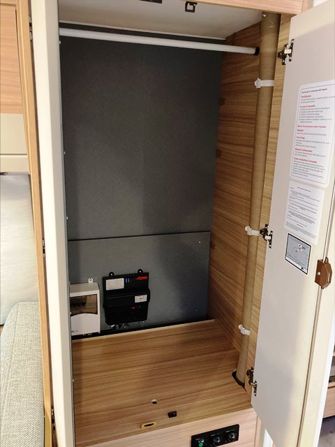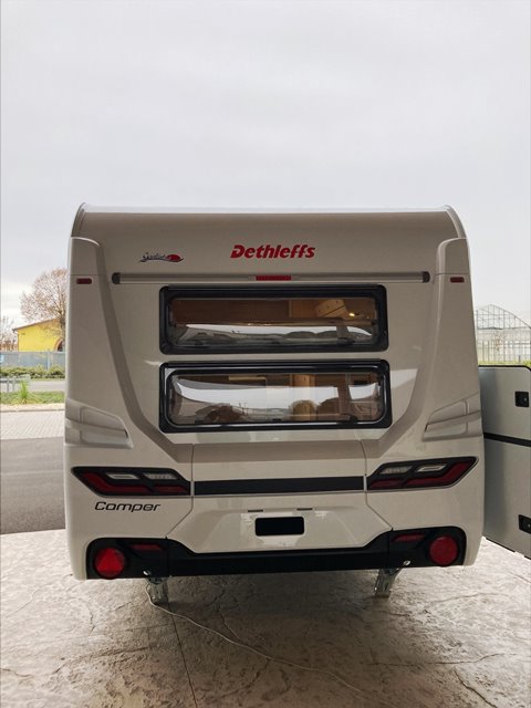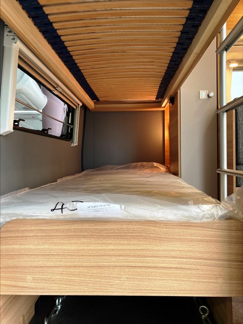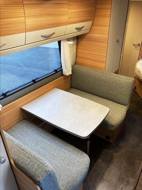 Caravan con letto alla francese in testa e bagno a fianco, dinette classica, cucina laterale in linea, letti a castello trasversali.