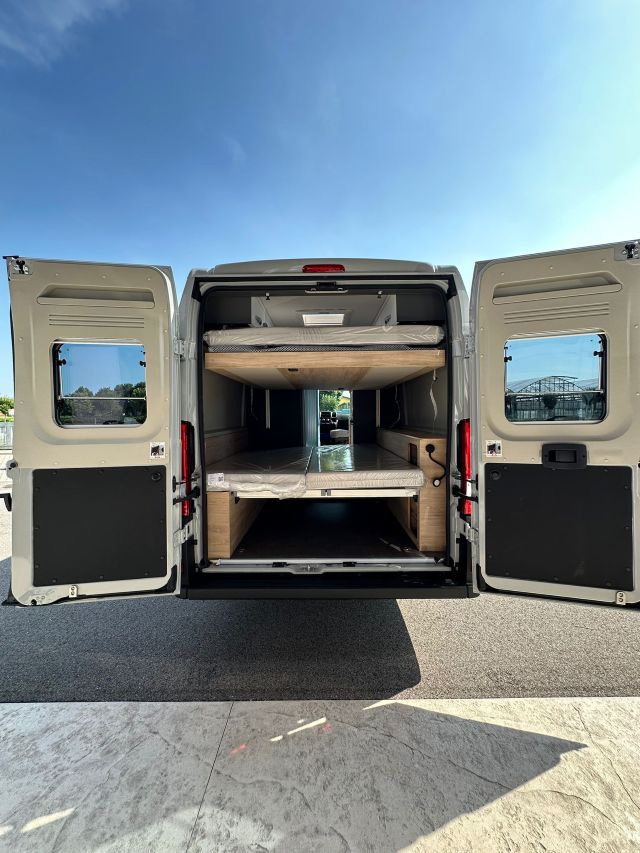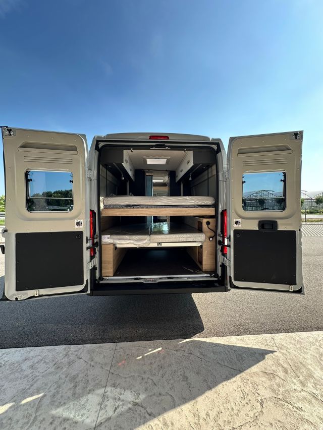 Furgonato con semi-dinette avanzata, cucina laterale in linea, letti matrimoniali longitudinali a castello, bagno e doccia laterali.