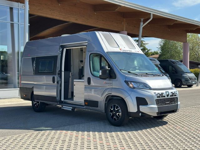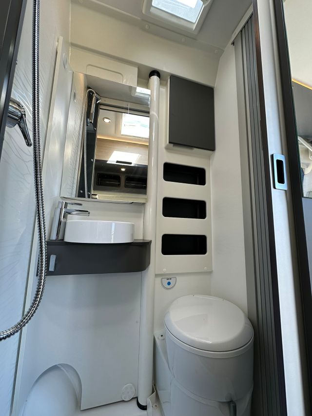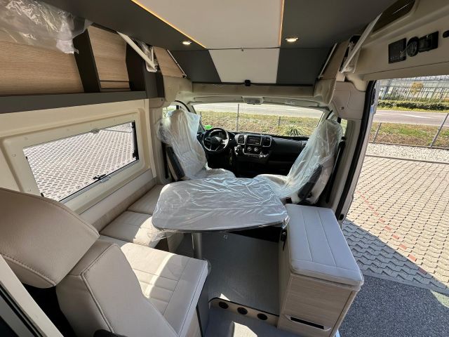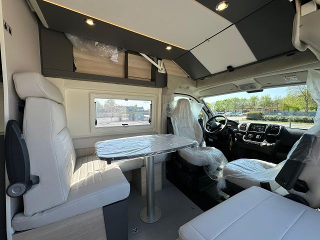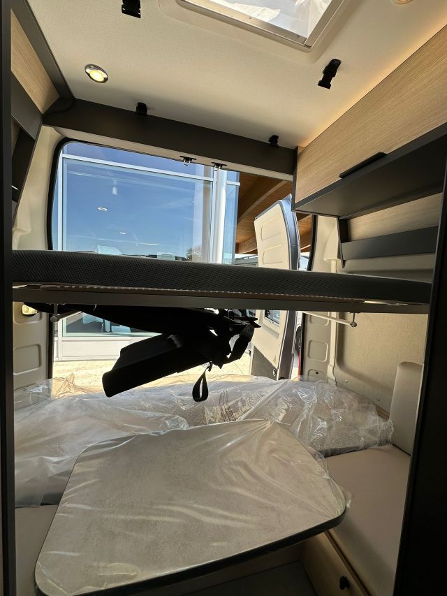 Furgonato con semi-dinette avanzata e seduta laterale, cucina laterale in linea, dinette posteriore, letti a castello trasversali, bagno e doccia laterali.