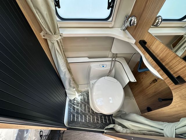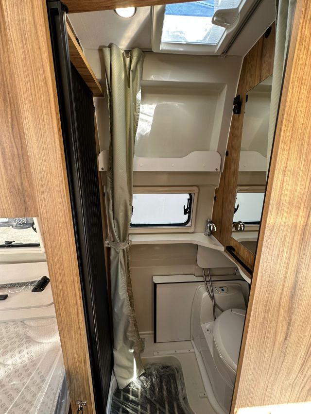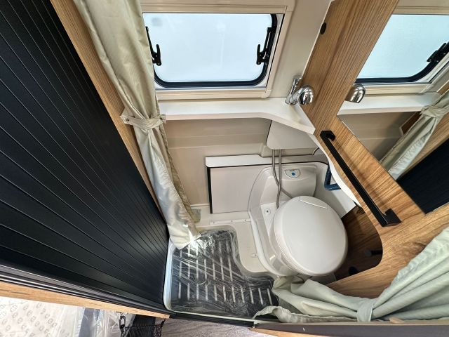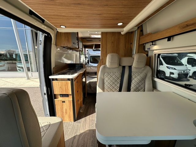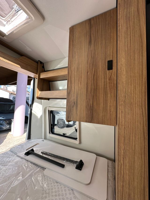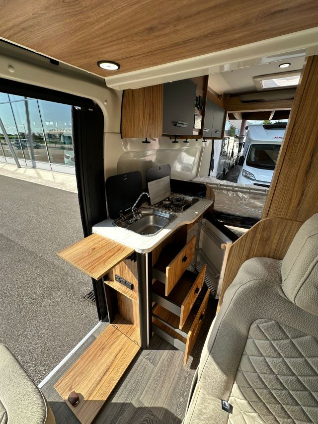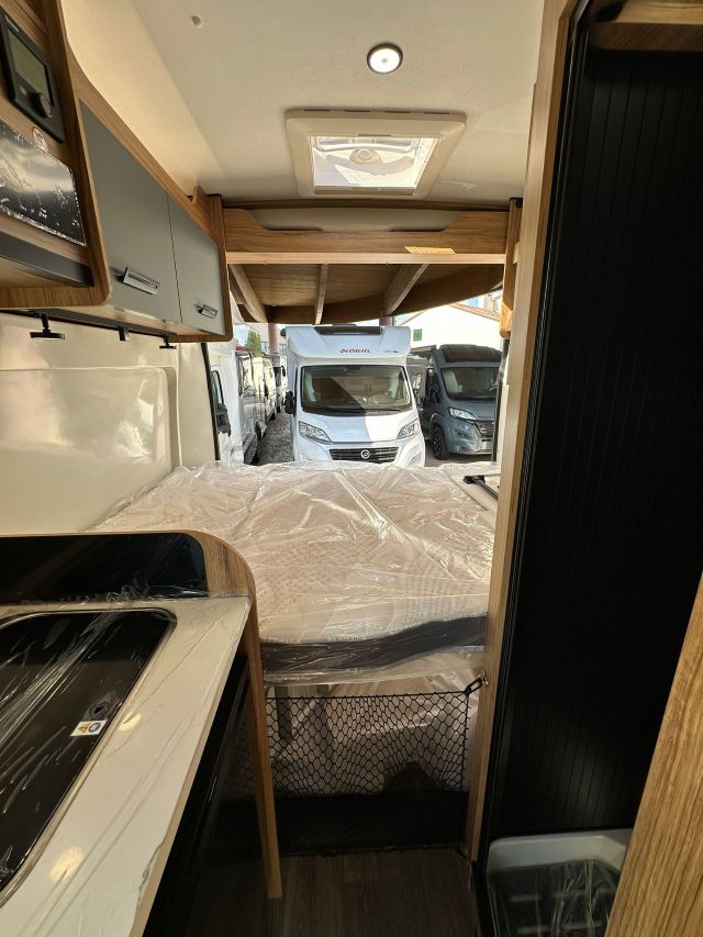 Furgonato con semi-dinette avanzata e seduta laterale, cucina laterale in linea, letto matrimoniale trasversale, bagno e doccia laterali.