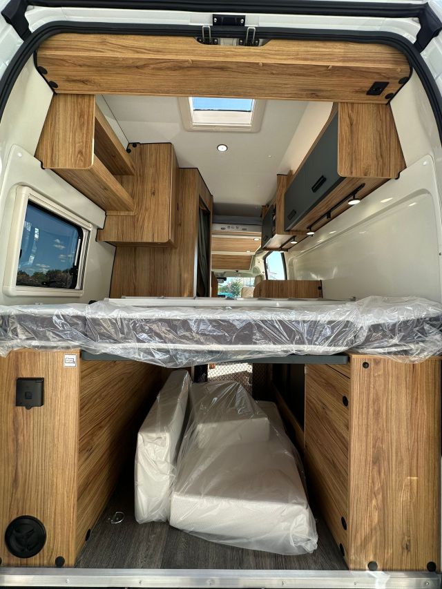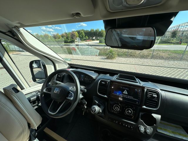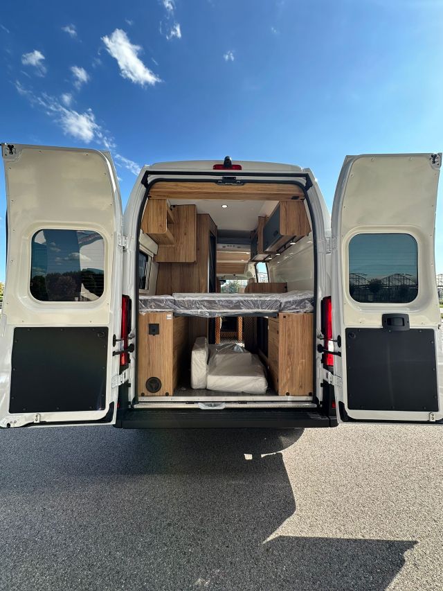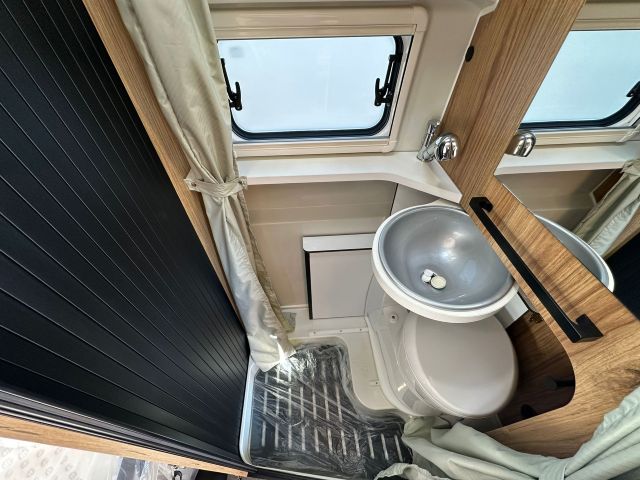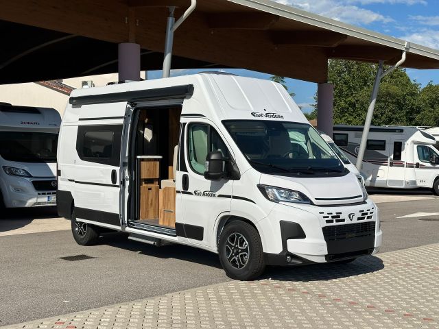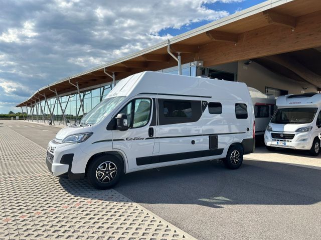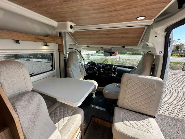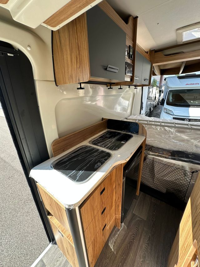 Furgonato con semi-dinette avanzata e seduta laterale, cucina laterale in linea, letto matrimoniale trasversale, bagno e doccia laterali.