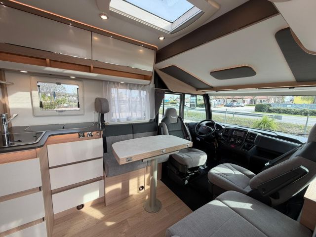 Motorhome su con dinette faccia a faccia, cucina laterale ad “L”, letto nautico, doccia laterale e bagno in coda.