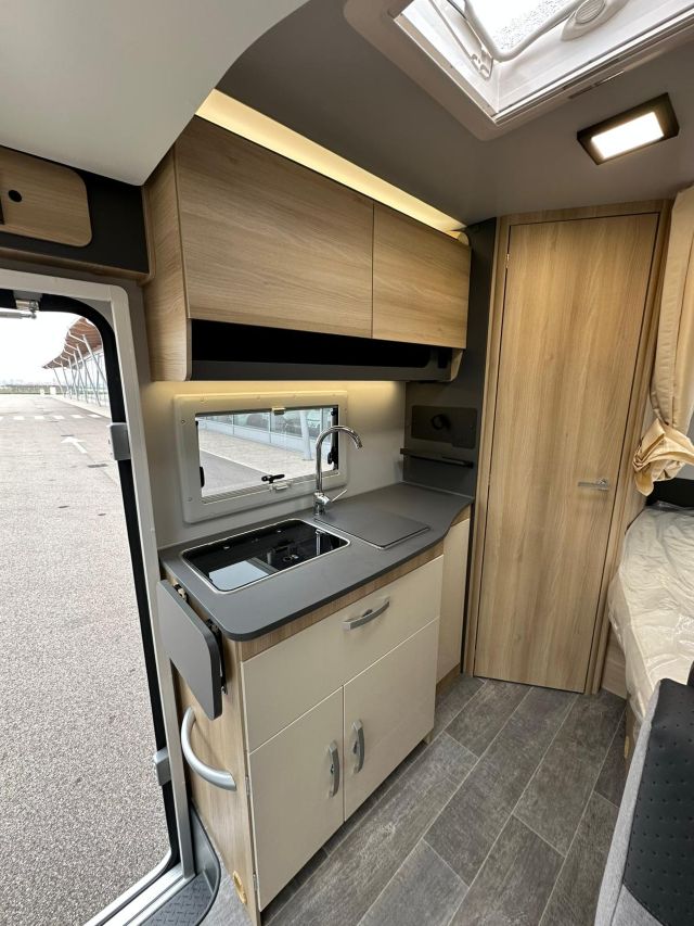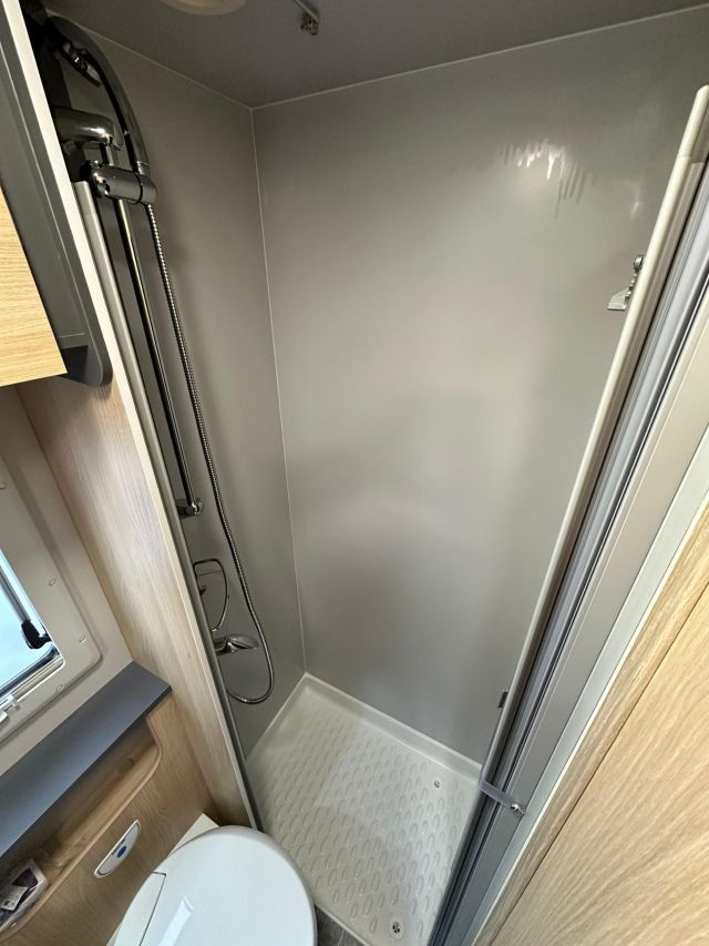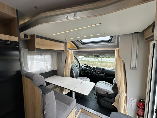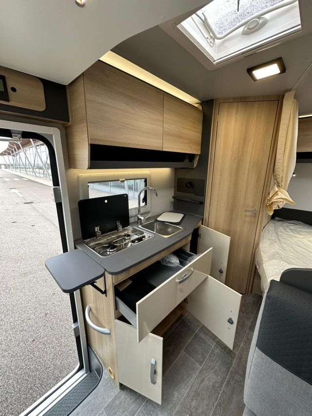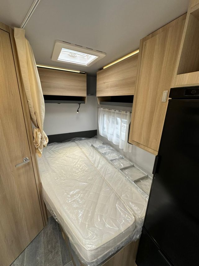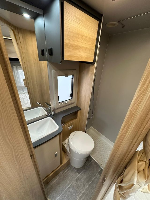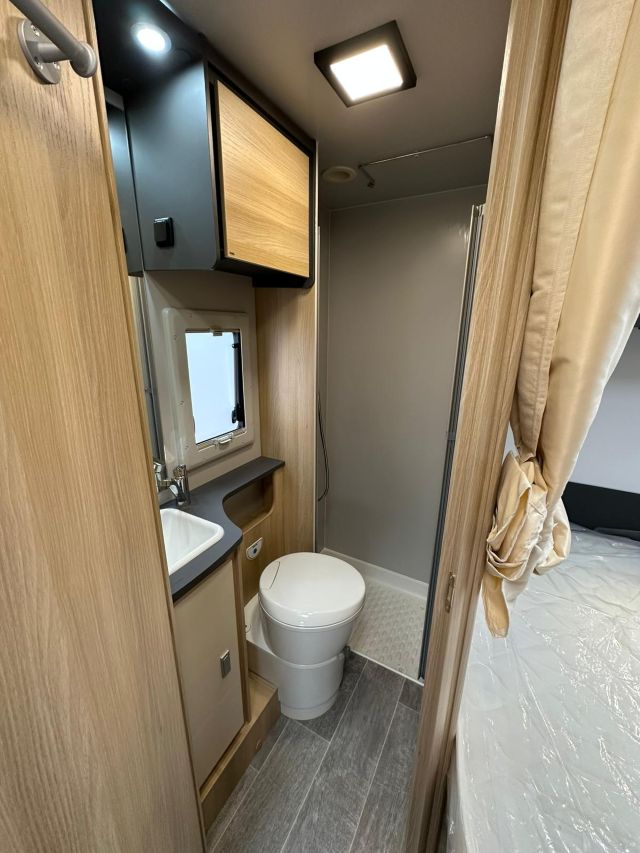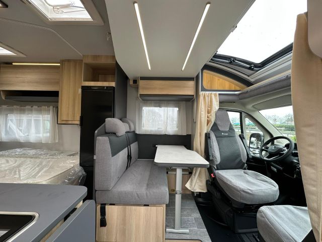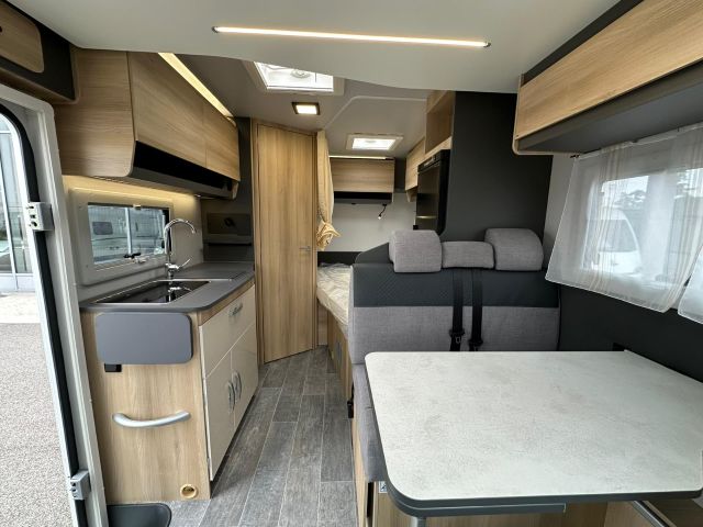 Semintegrale con semi-dinette avanzata, cucina laterale in linea, letto basculante, letto alla francese, bagno e doccia in coda.