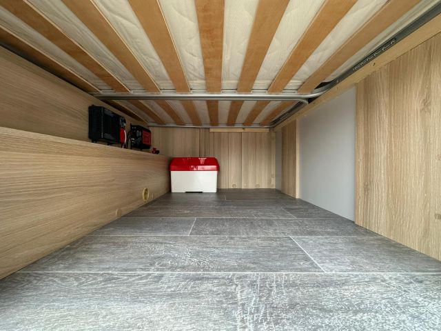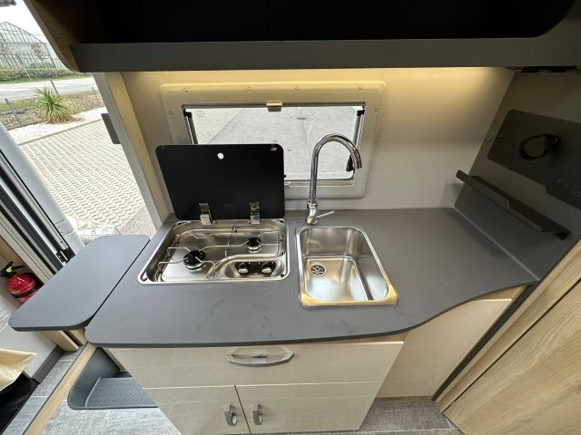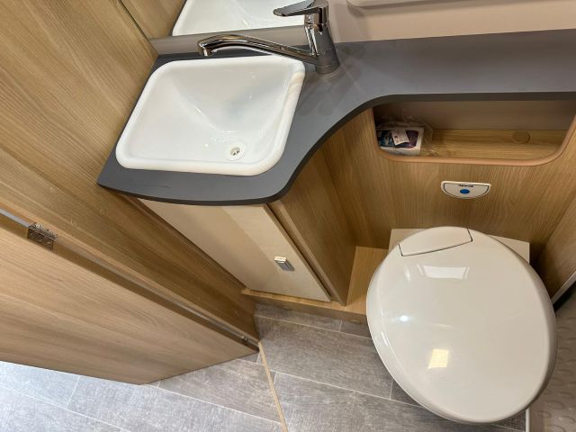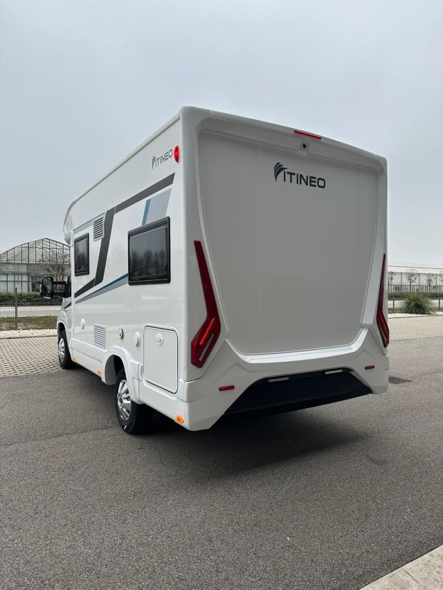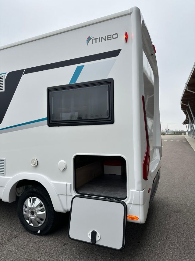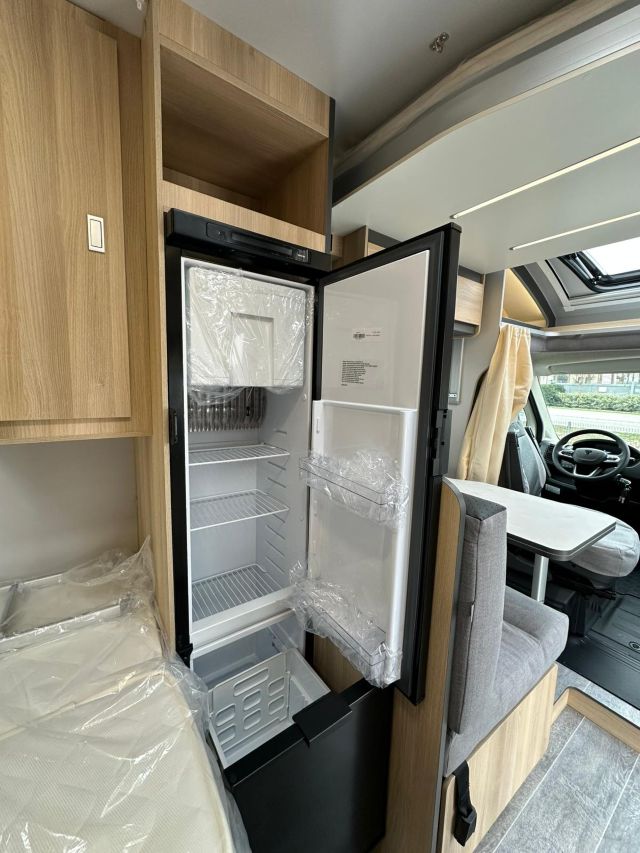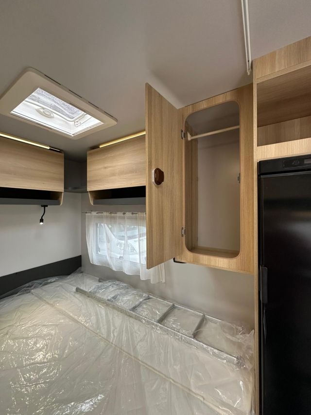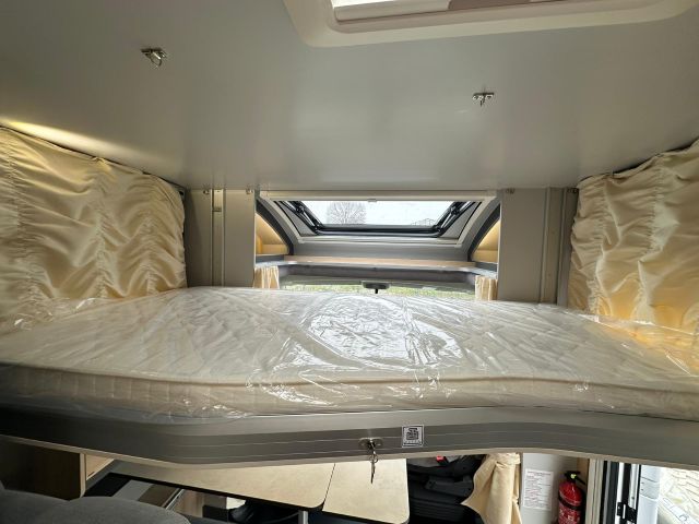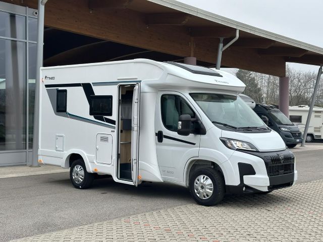 Semintegrale con semi-dinette avanzata, cucina laterale in linea, letto basculante, letto alla francese, bagno e doccia in coda.