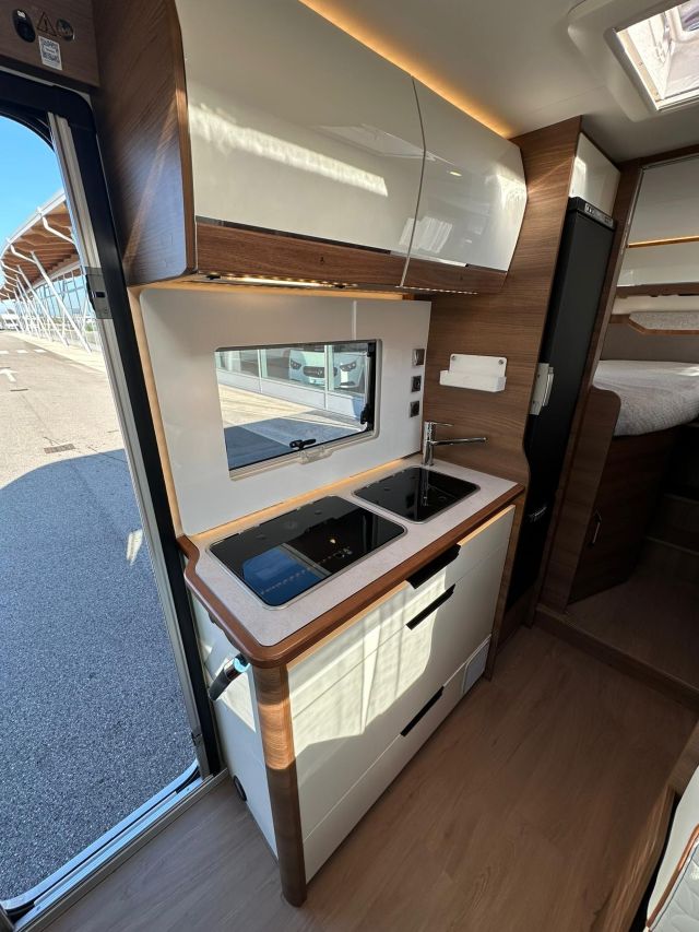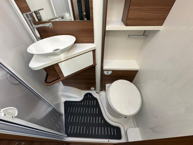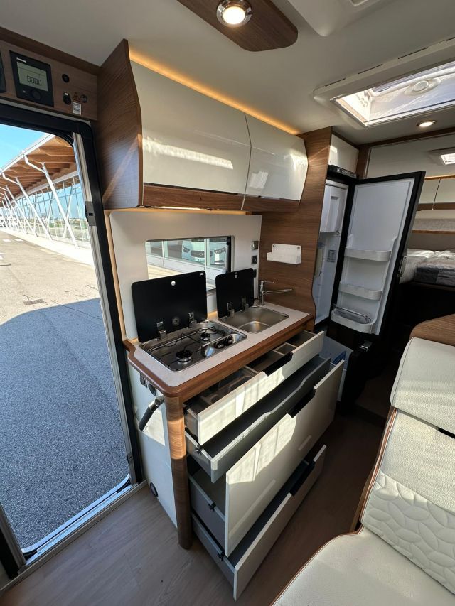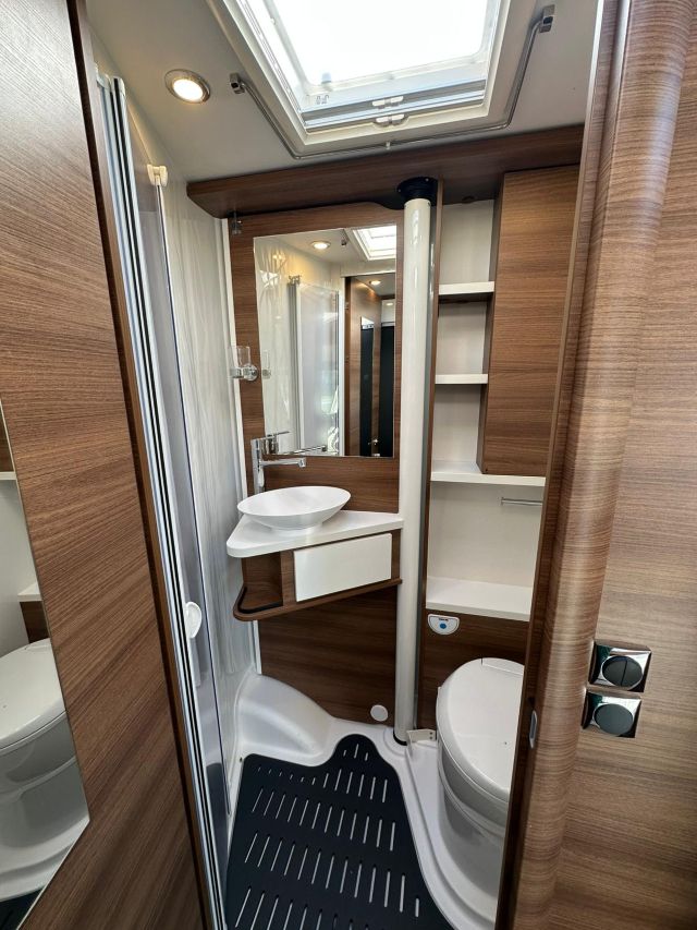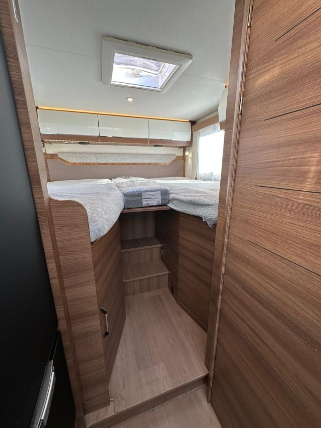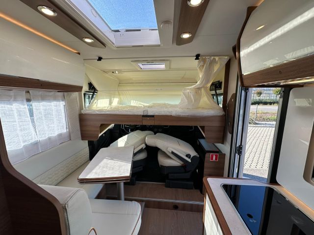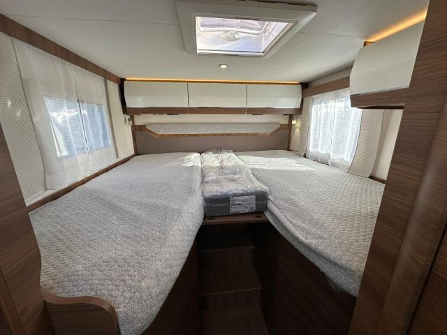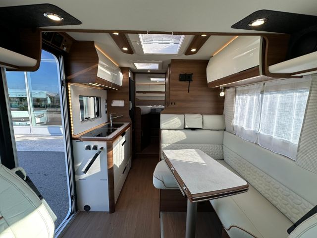 Motorhome con dinette semi-dinette avanzata, cucina laterale in linea, letti gemelli, bagno e doccia laterali.