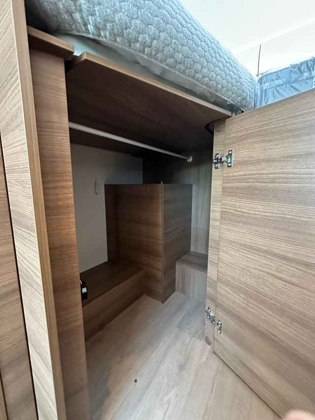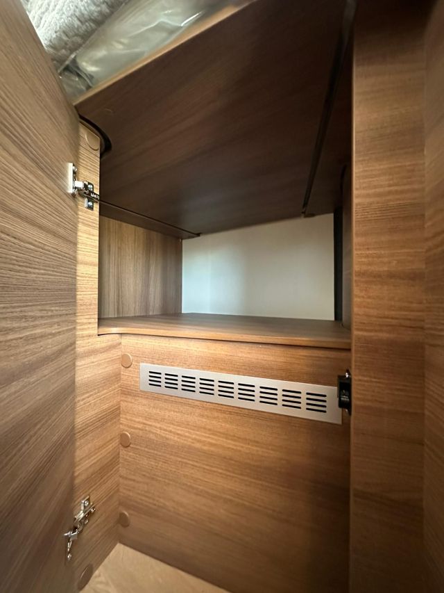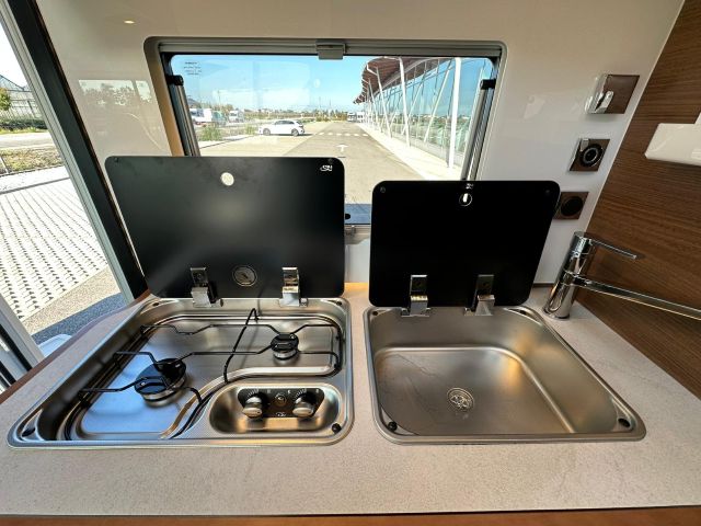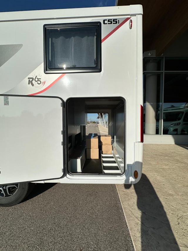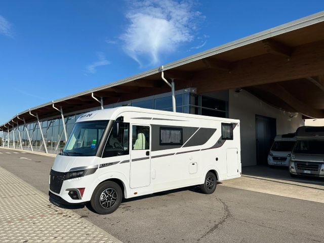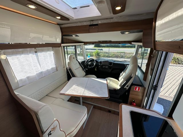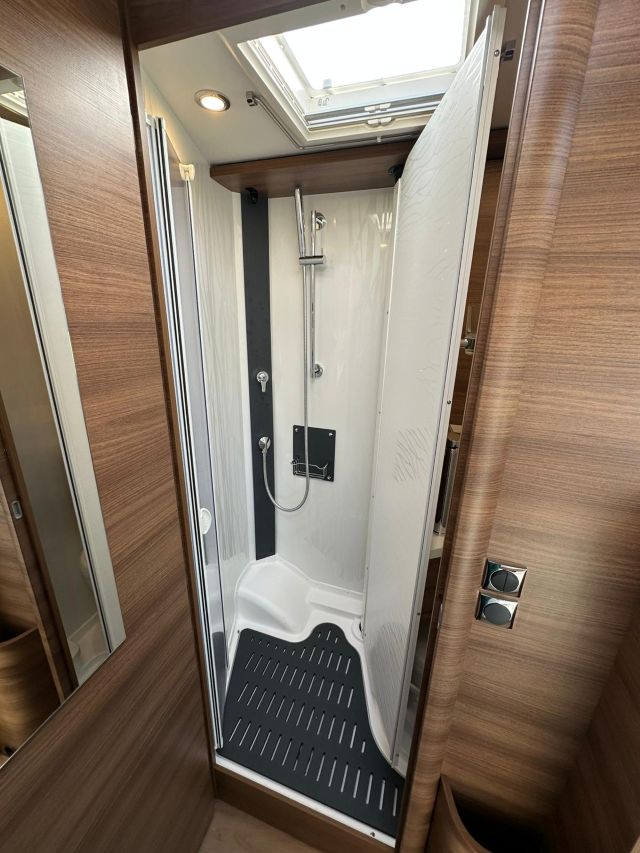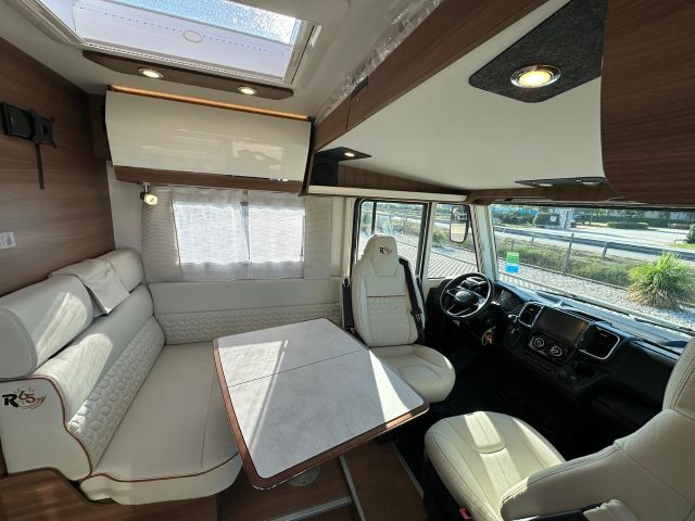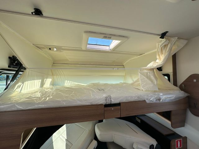 Motorhome con dinette semi-dinette avanzata, cucina laterale in linea, letti gemelli, bagno e doccia laterali.