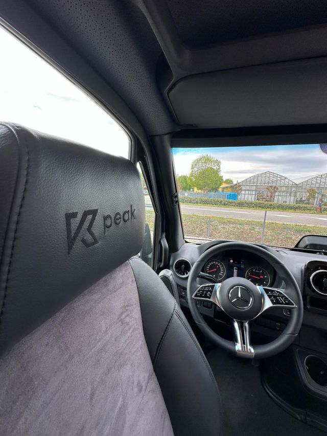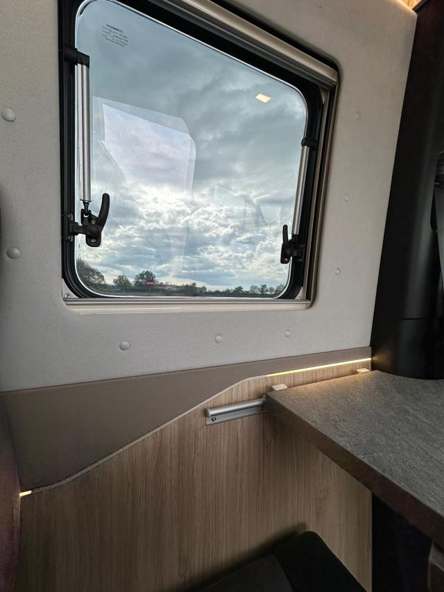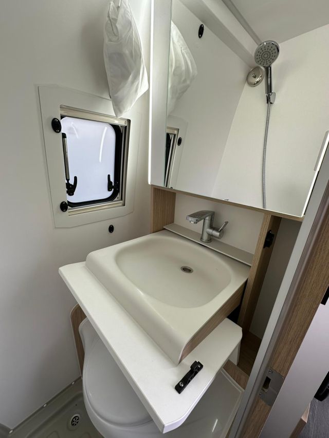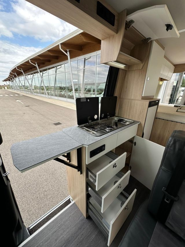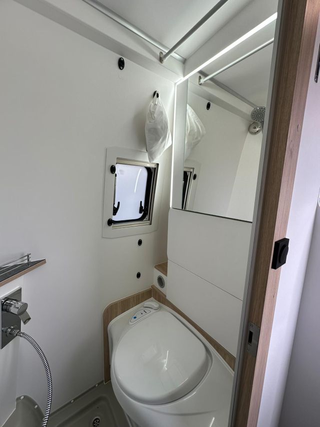 Furgonato semi-dinette avanzata, cucina laterale in linea, letto matrimoniale trasversale, bagno e doccia laterali, tetto a soffietto.